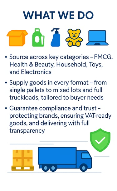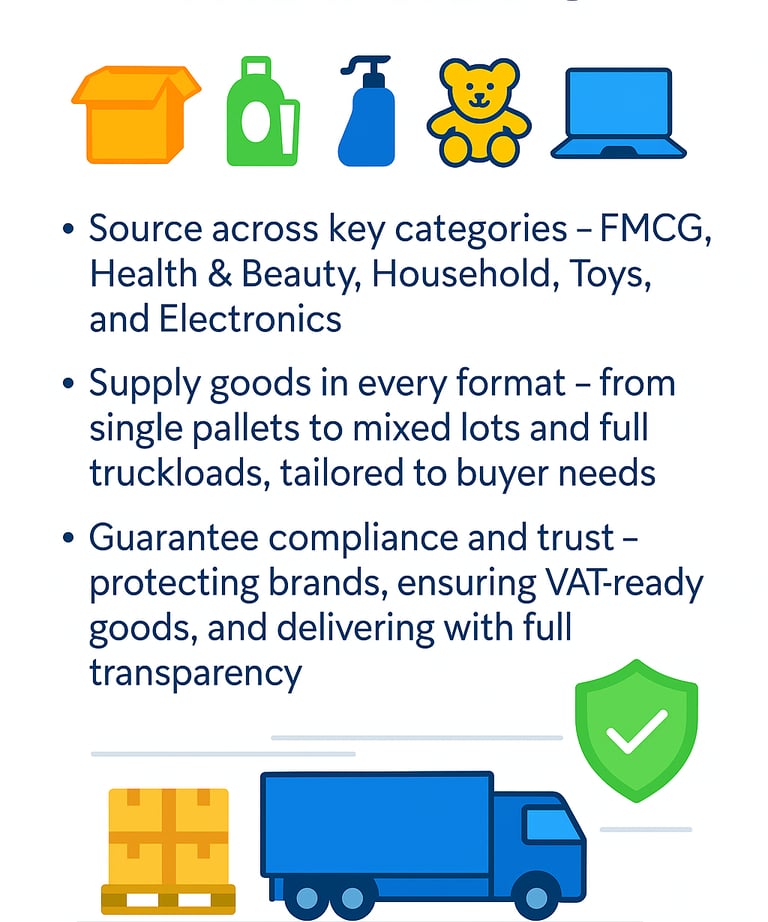 We focus on FMCG, Health & Beauty, Oral Care, Household Goods, Toys, and Electronics — supplying in pallets, truckloads, and containers to meet the needs of our trade partners.